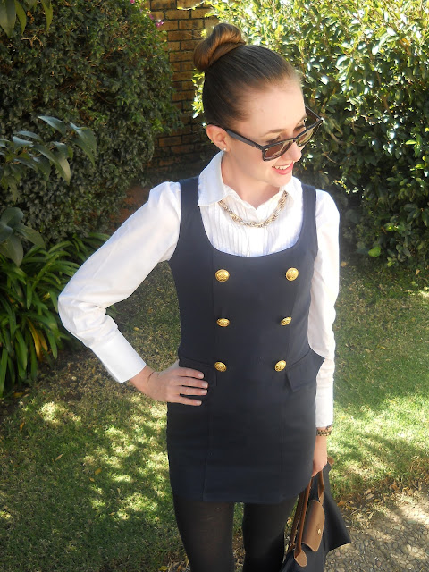 Mr Price shirt, Mr Price dress, Woolworths tights, Ray Ban sunnies, Longchamp bag.